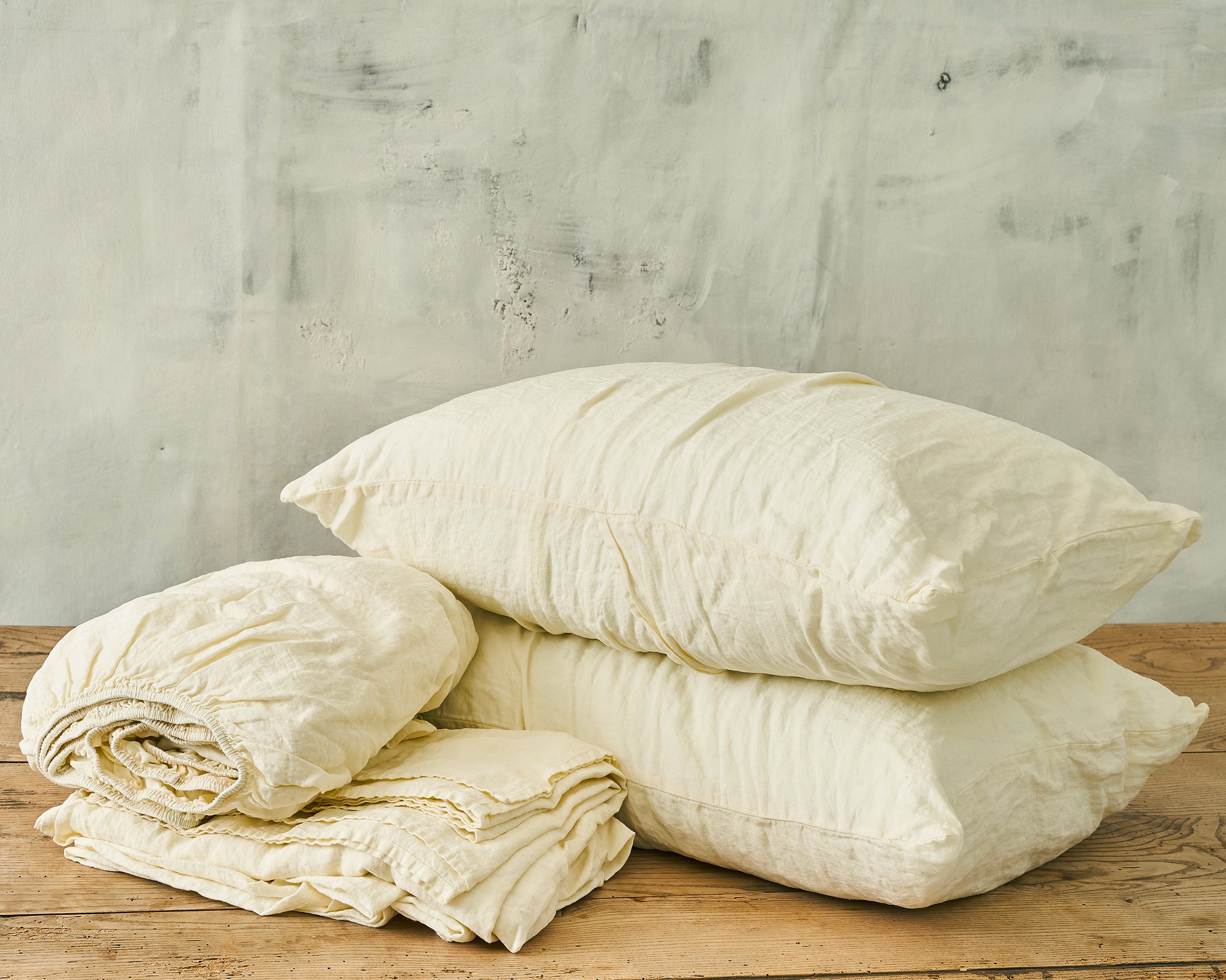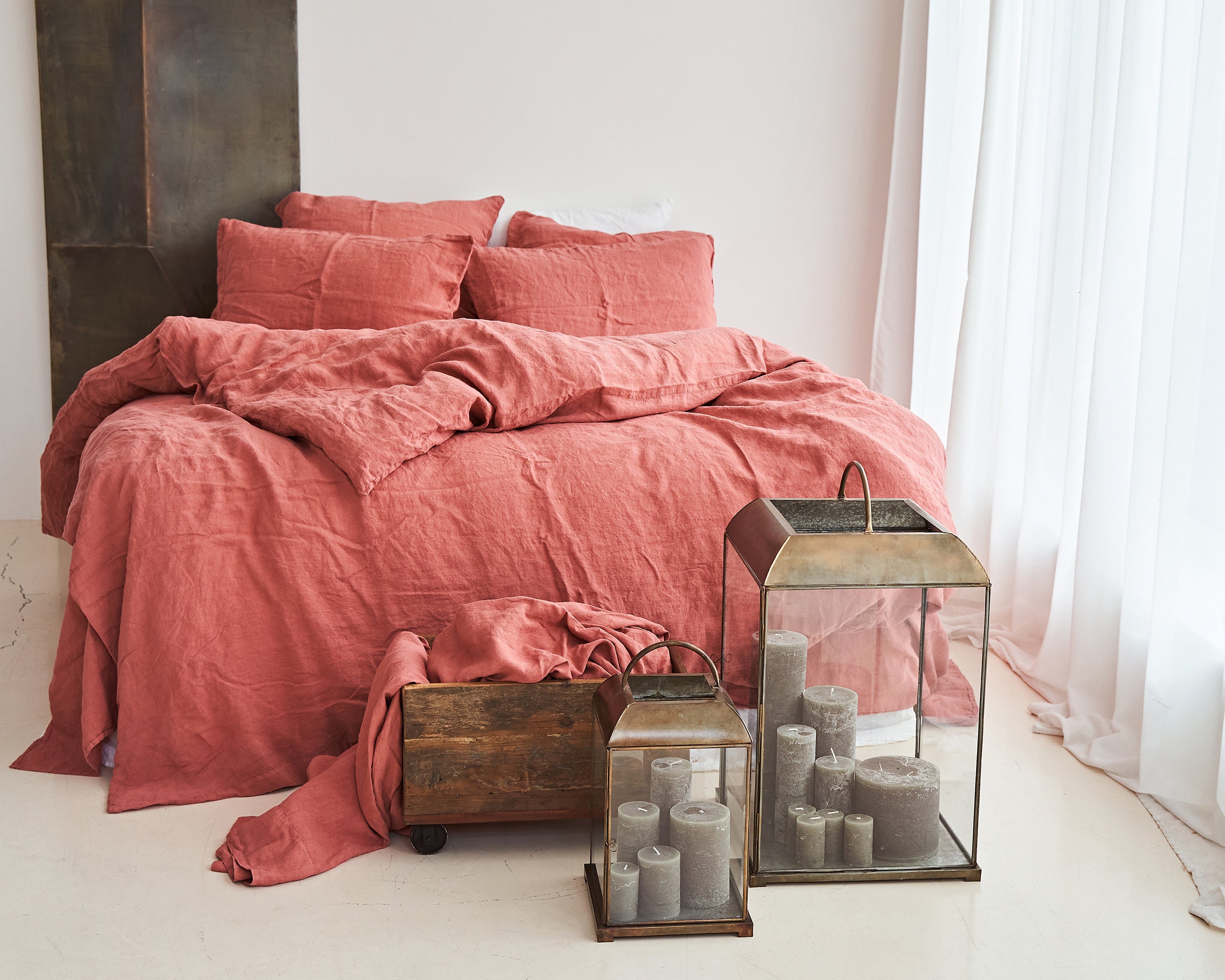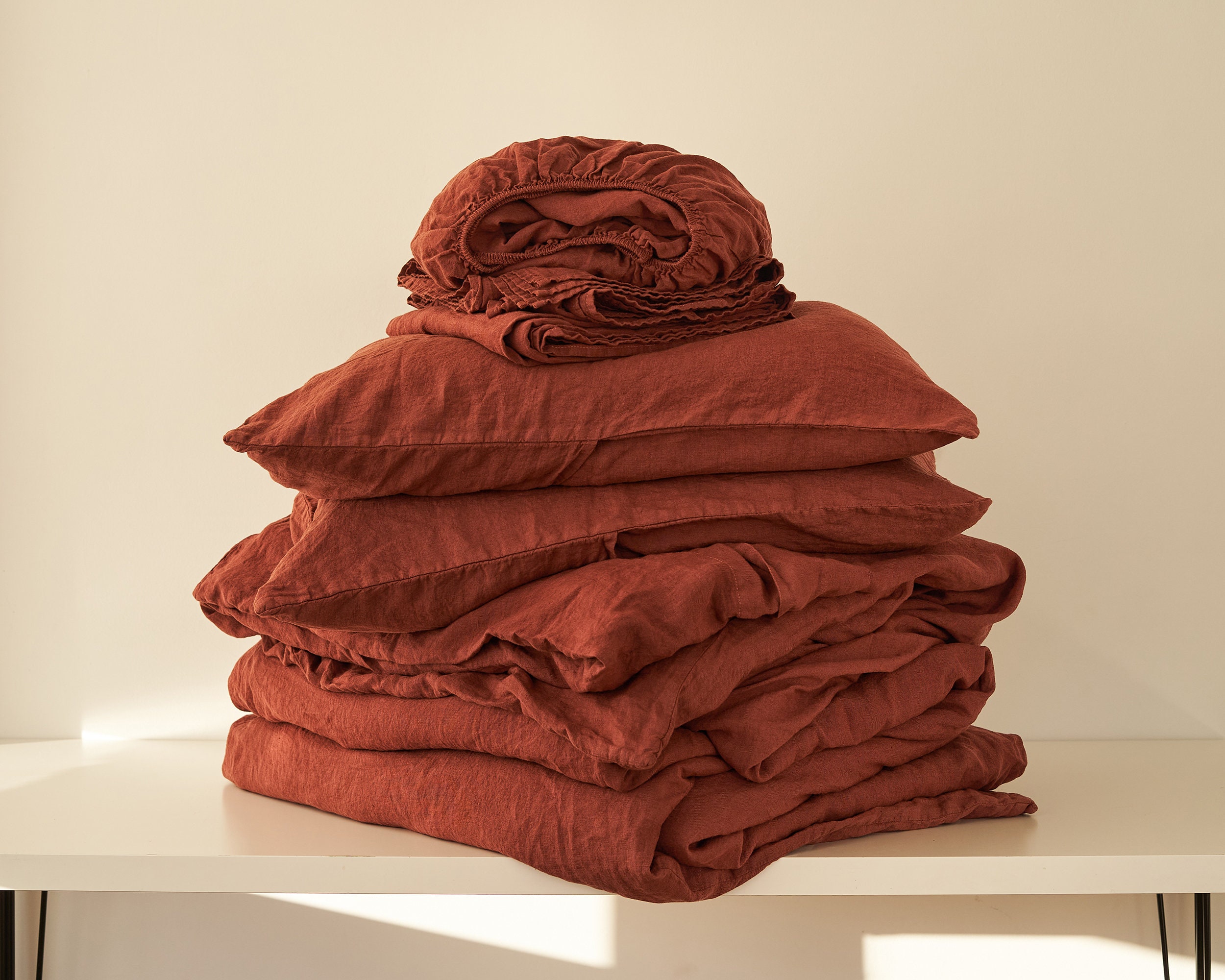 Cream Linen – Your textile base, covering bedding and the rug. Sits between white and beige with a natural, undyed quality. This is the colour that softens every hard surface and clean line in the room.