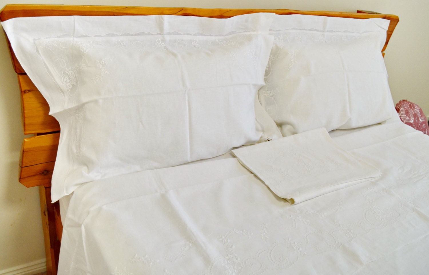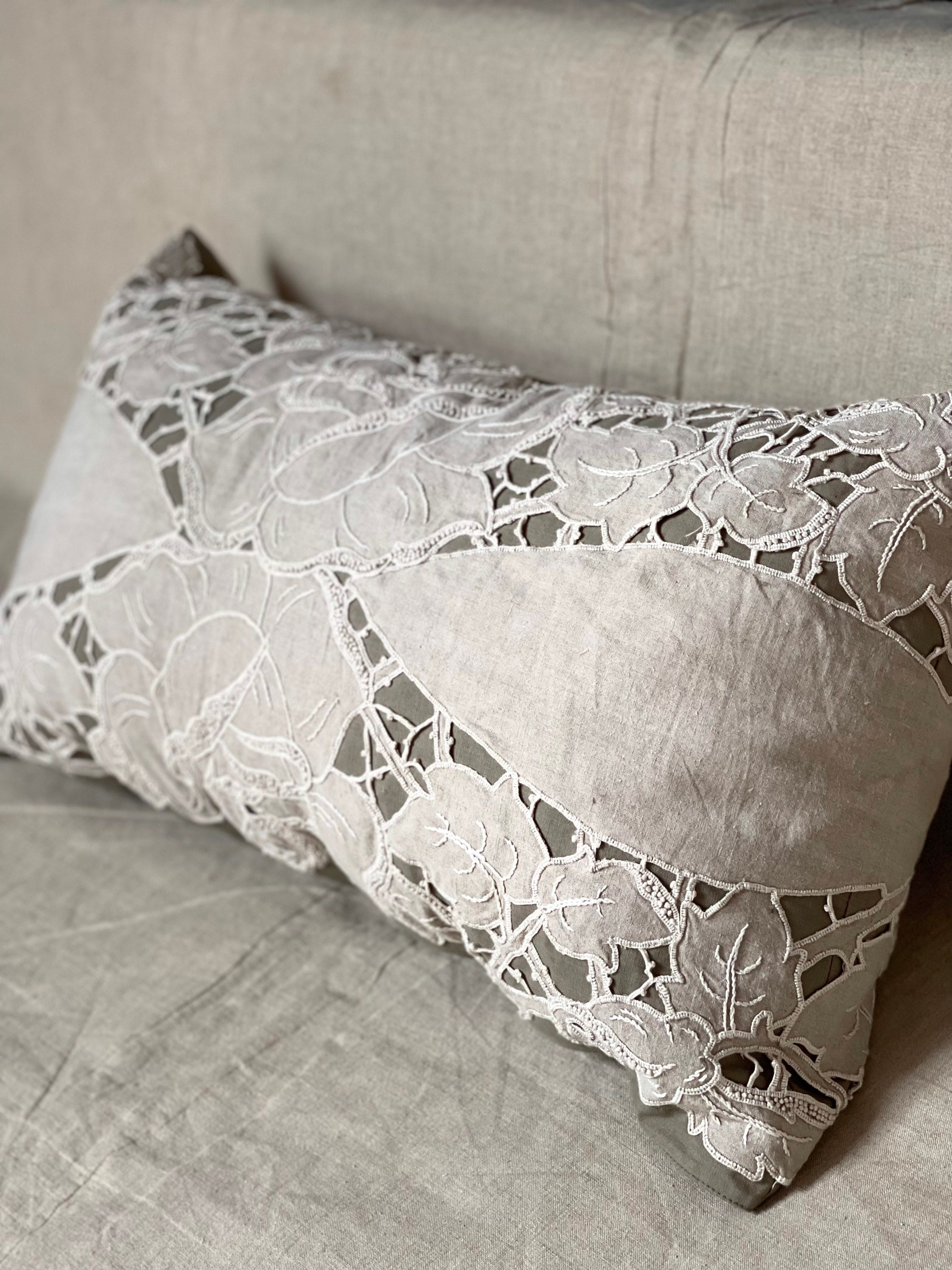 The pillow situation matters here. Two sleeping pillows, two Euro shams, one accent cushion. That’s it. Each one in a slightly different texture within the same neutral family. Linen, bouclé, raw cotton. The variation reads deliberate without looking decorated.